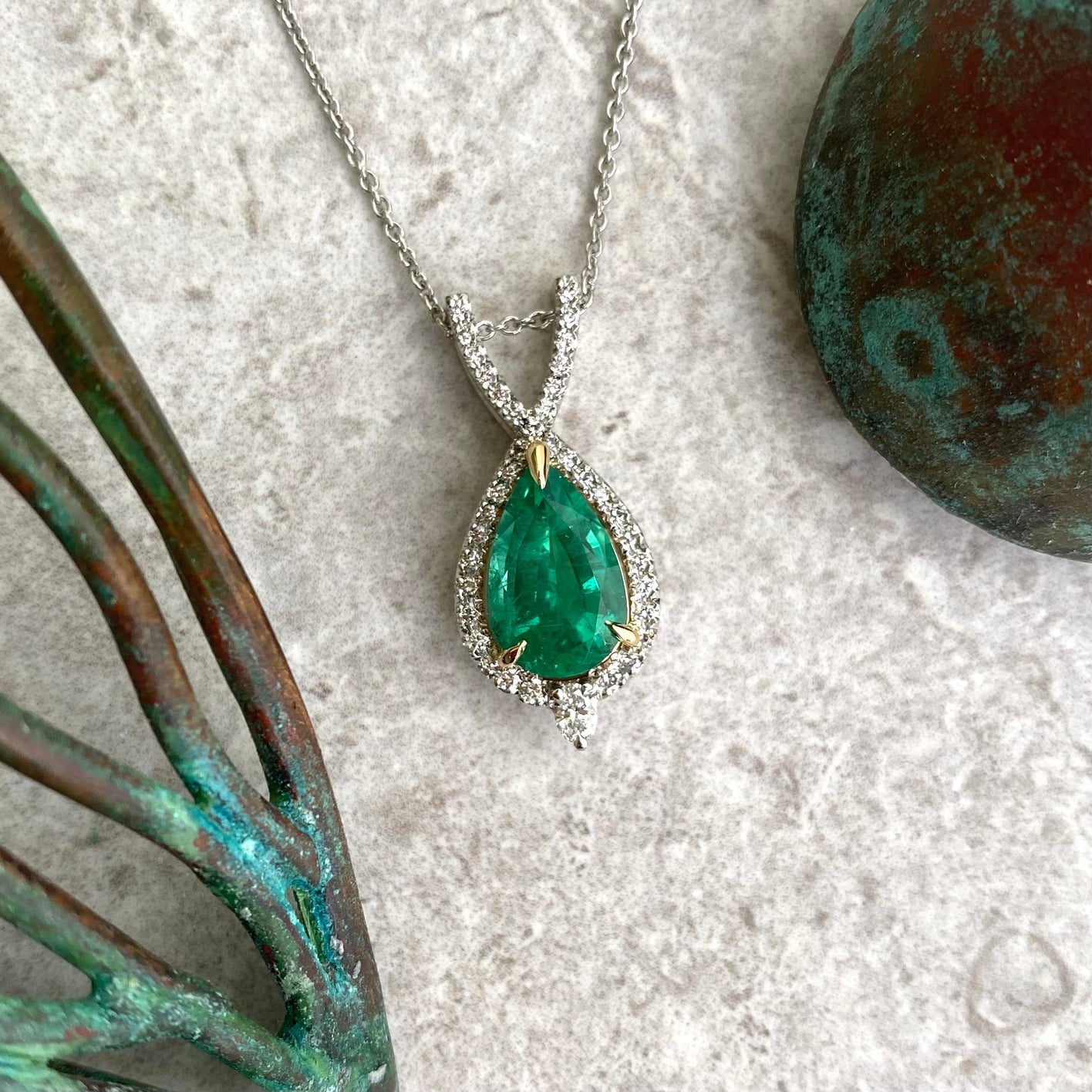 - One of a Kind. Emerald diamond halo pendant