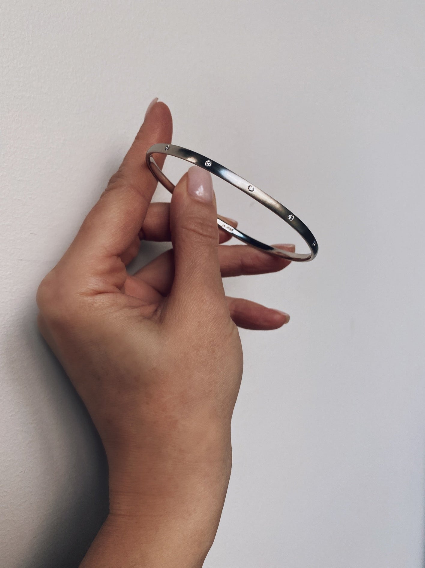 An everyday classic, this solid platinum bangle has a matte finish and is punch set with white diamonds for a little added sparkle.