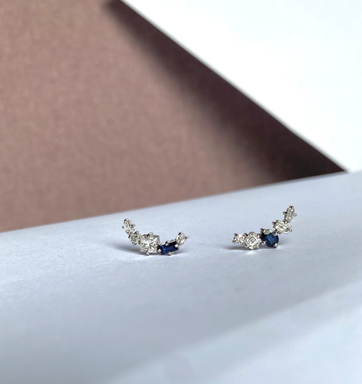Our beautiful Jolie sapphire and diamond studs, featuring baguette and oval sapphire with fancy shaped diamonds set in 18ct white gold. Our Everyday climber earrings can be styled in various ways, adding versatility and interest to any outfit.