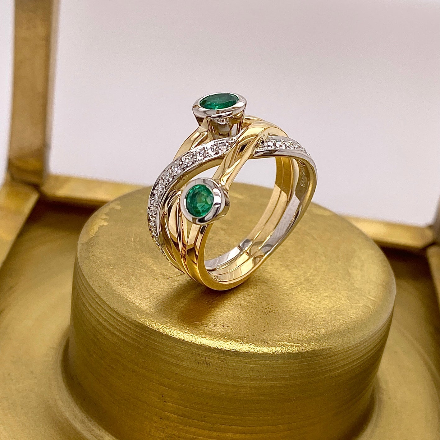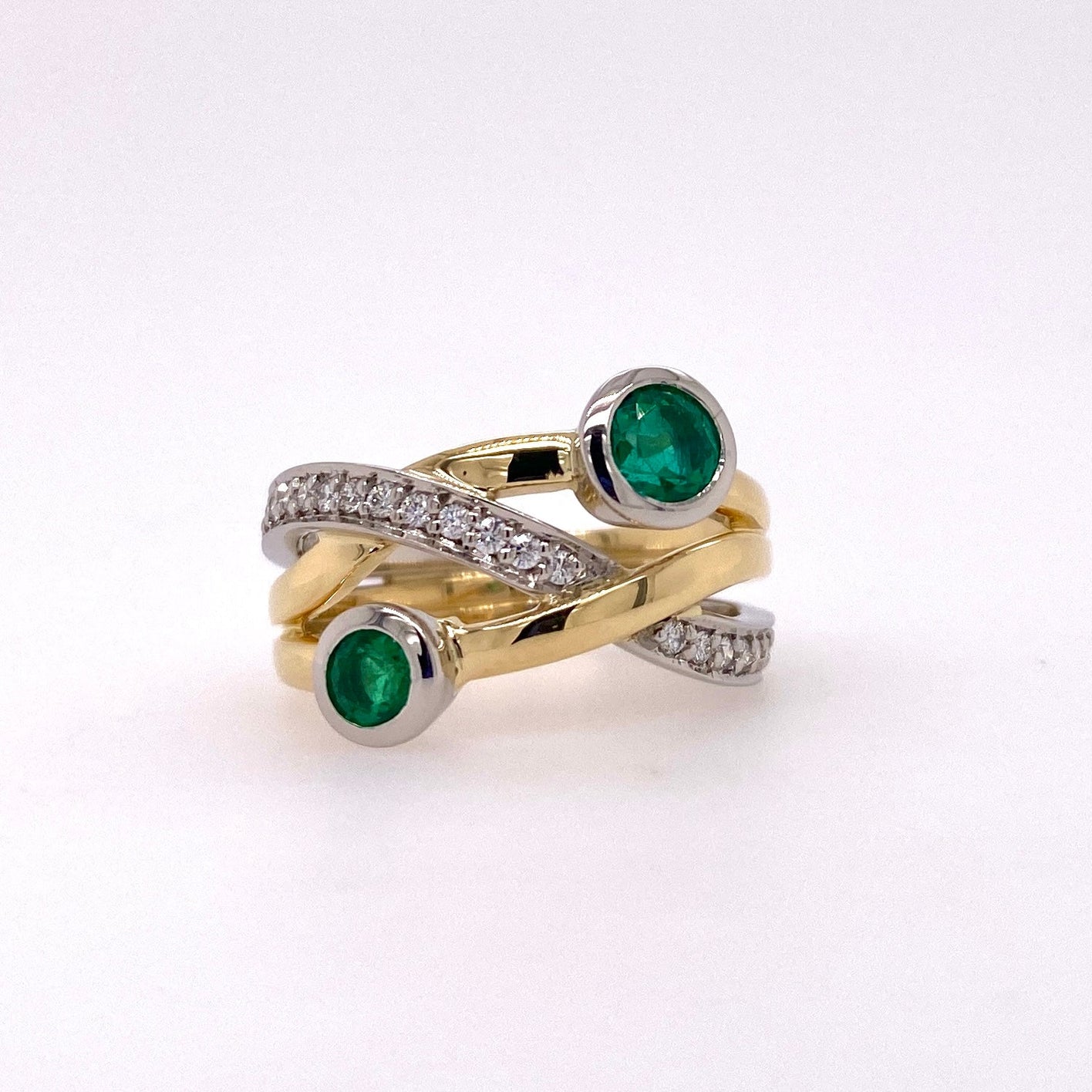 Intersecting bands of 18ct yellow gold and platinum wind around two beautiful round emeralds, with pave set white diamonds.