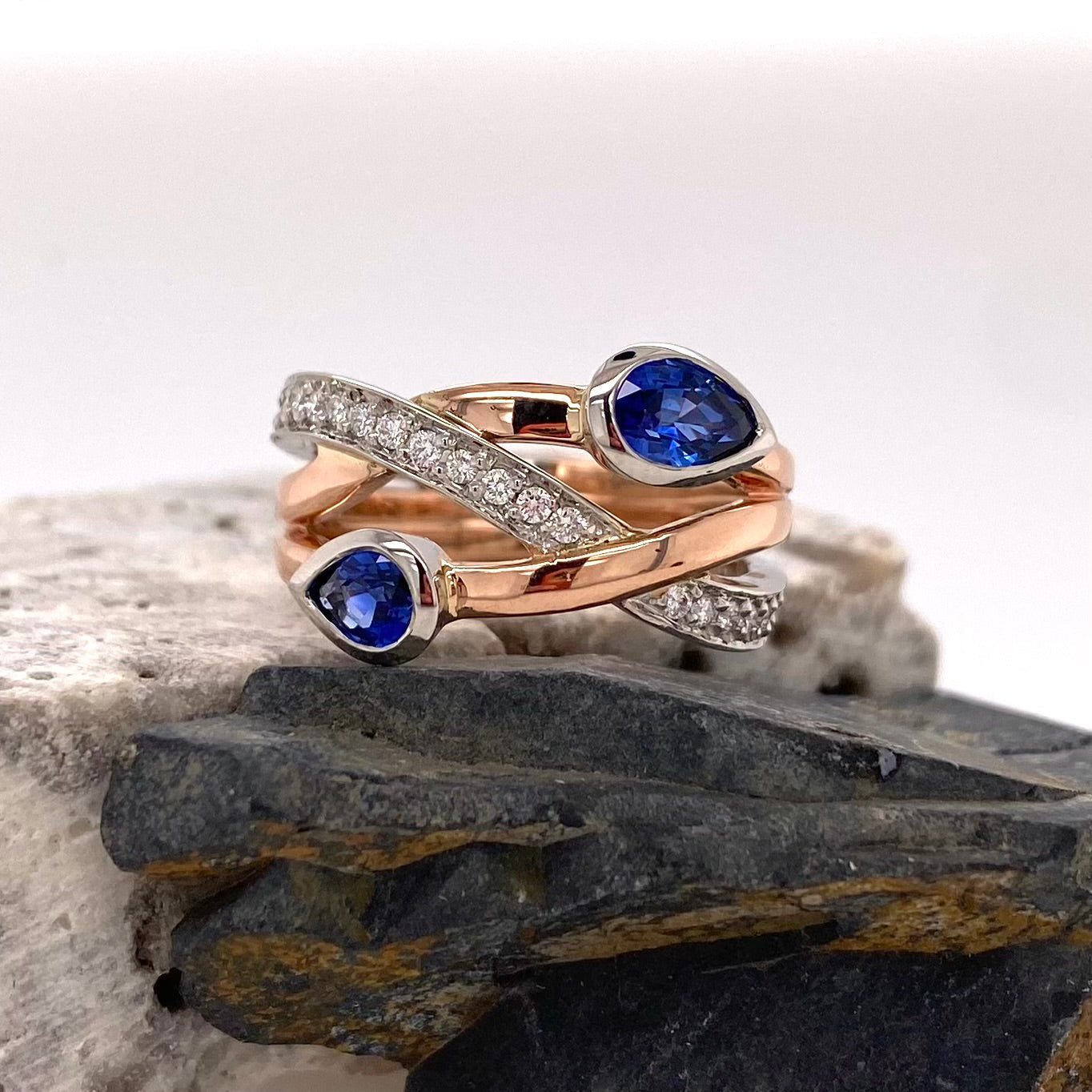 Two pear shaped sapphires sit in a twist of rose gold and platinum, accentuated with white diamond pave.