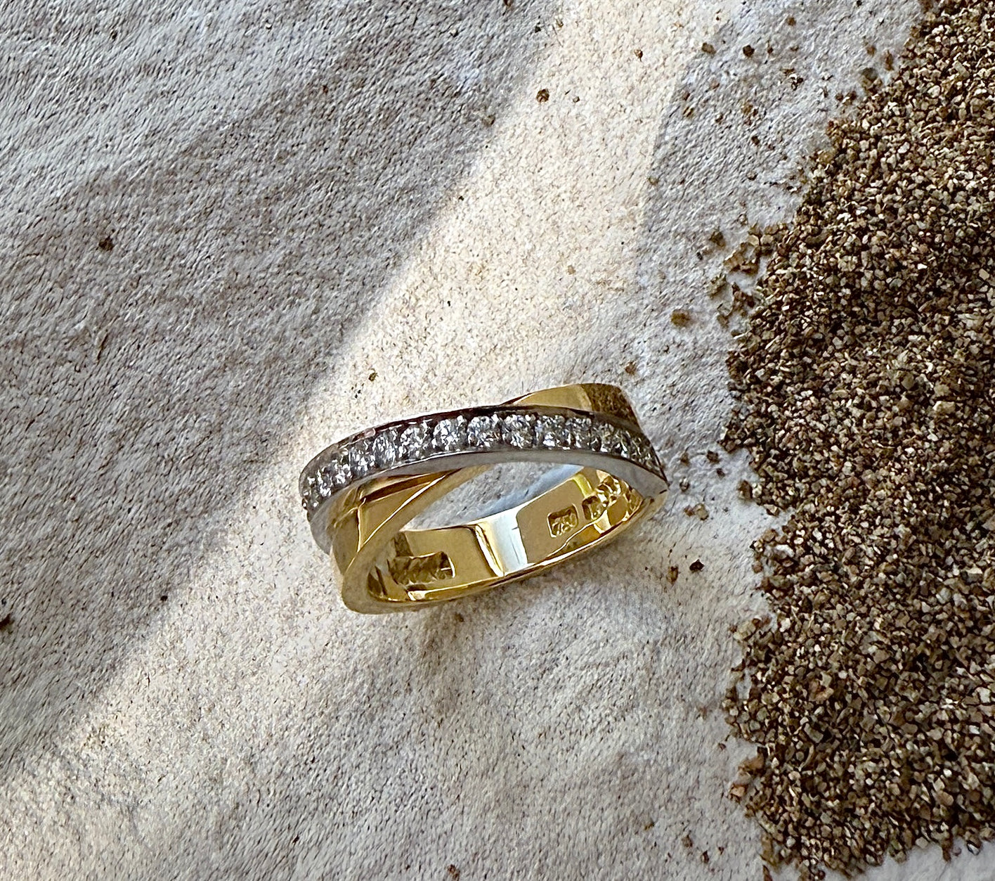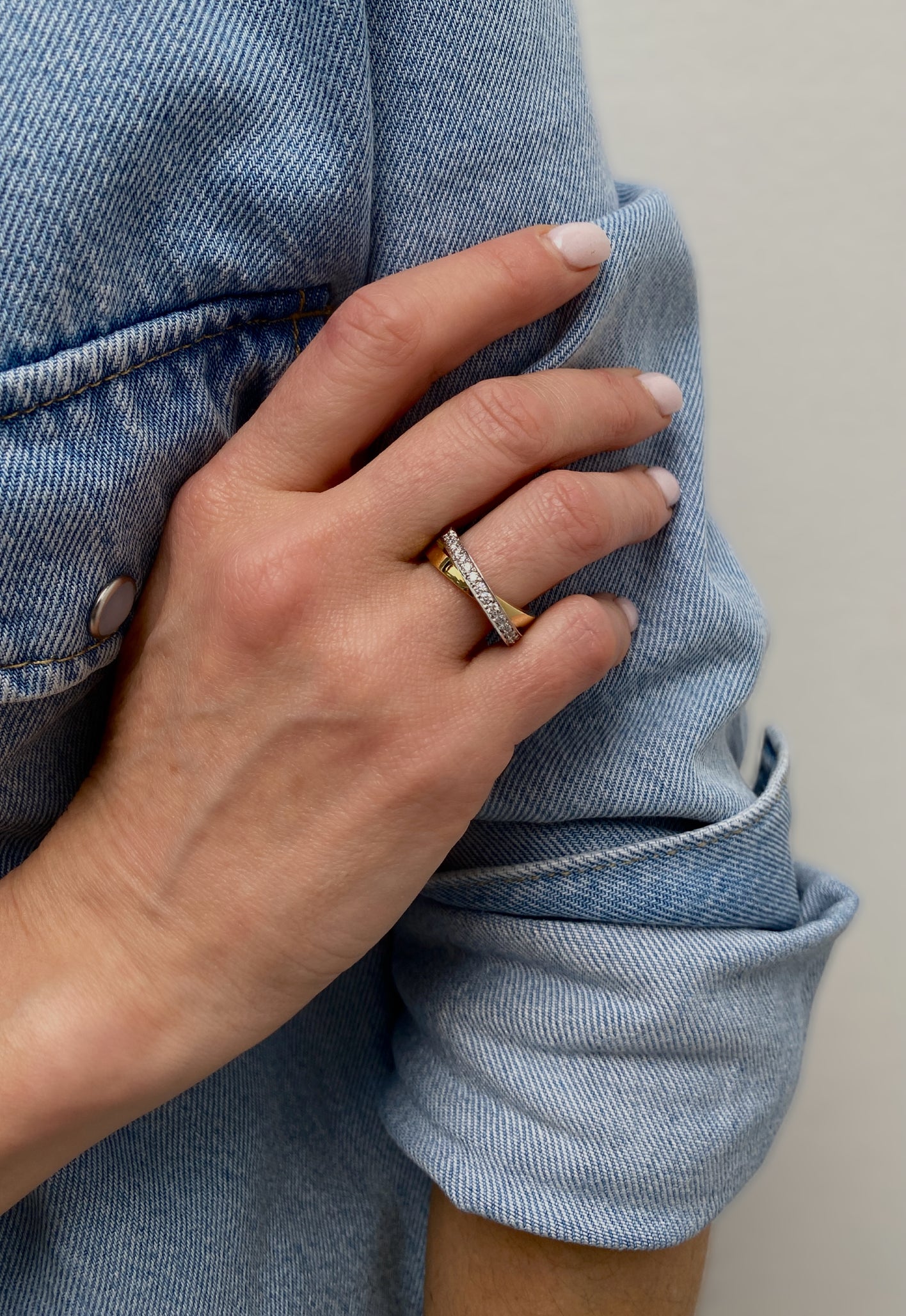 All 18ct yellow gold, with a band of pave set natural diamonds in platinum, this design is a popular choice for everyday wear, for those that like their diamonds served on the diagonal.