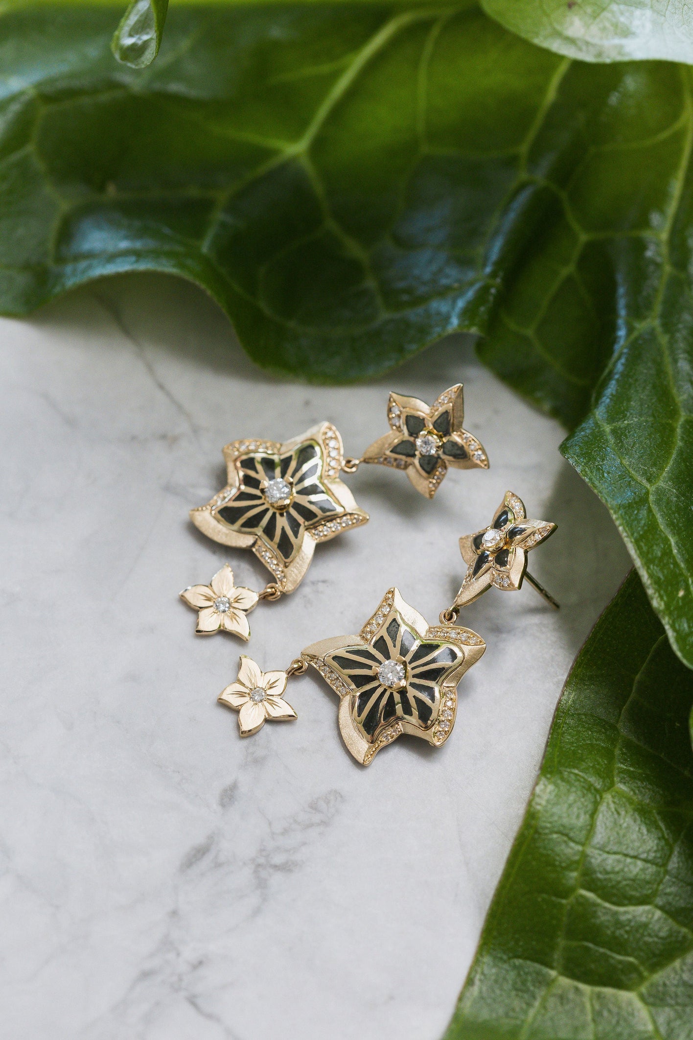 Cascading flowers will catch the eye…..grey and gold enamel flowers tumble through these magnificent drop earrings, perfectly positioned for drama and effect.