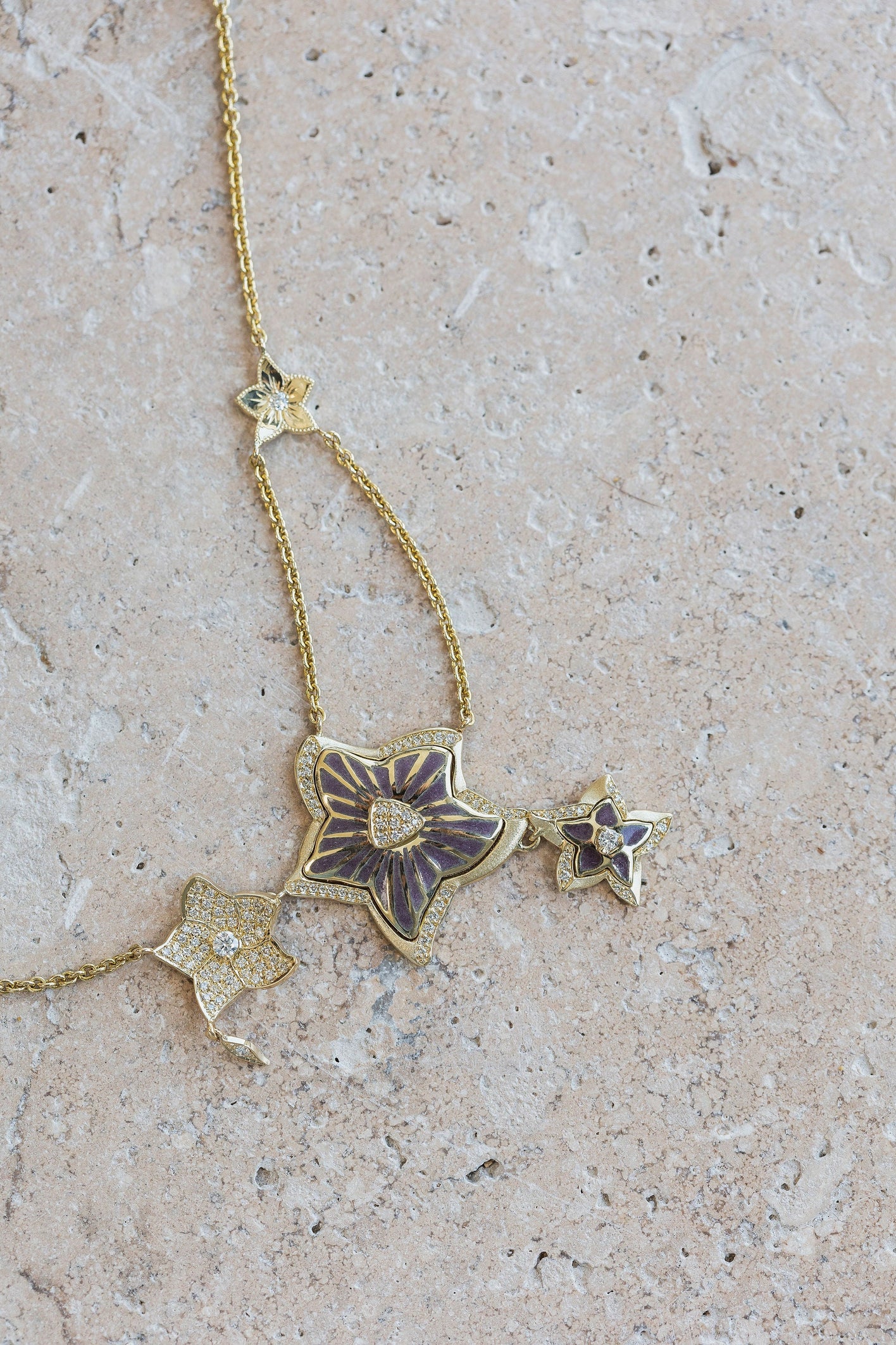 It features dark grey enamel flowers with 14ct gold and diamond flowers randomly linked together with 18ct yellow gold chain. The necklace is certainly an eye catcher!