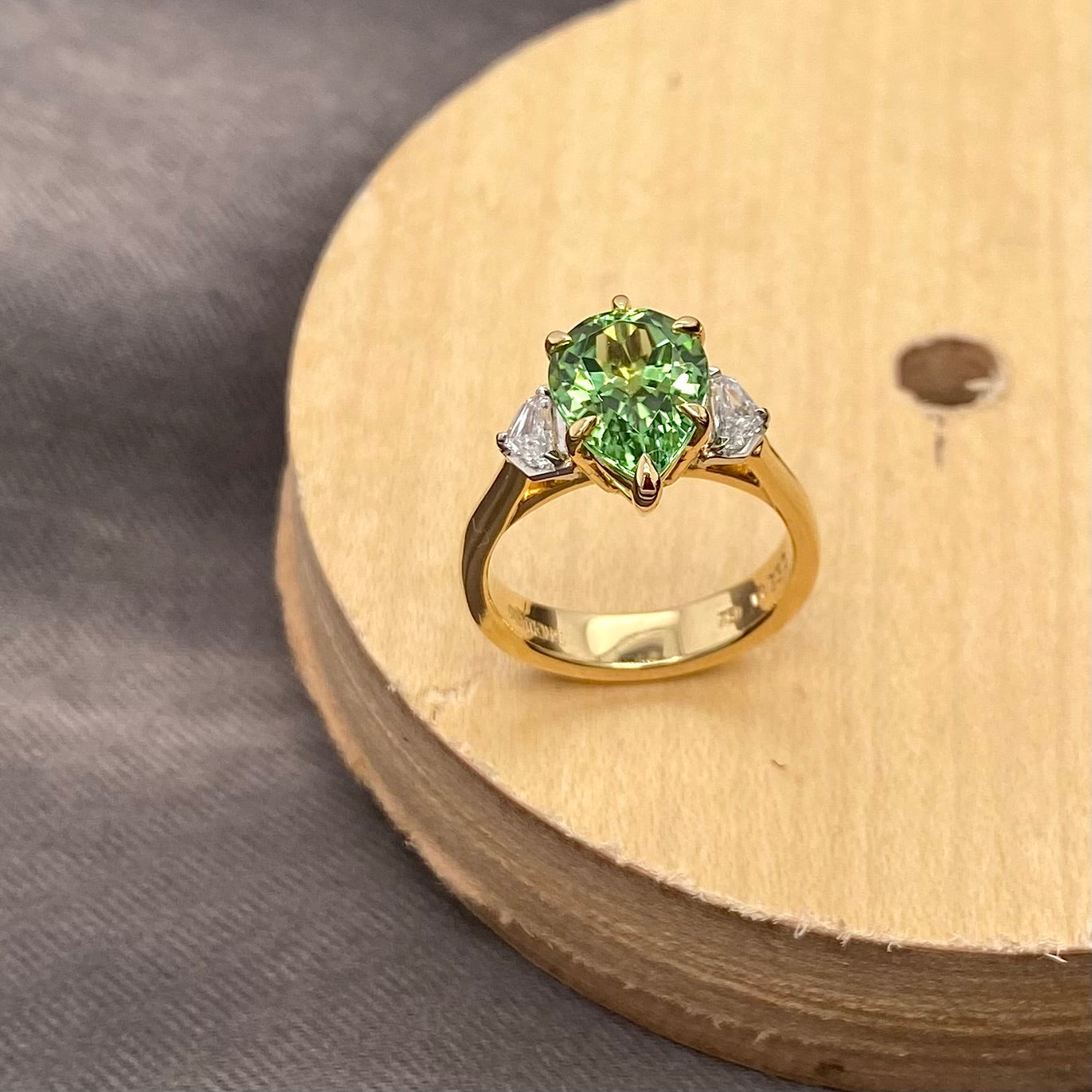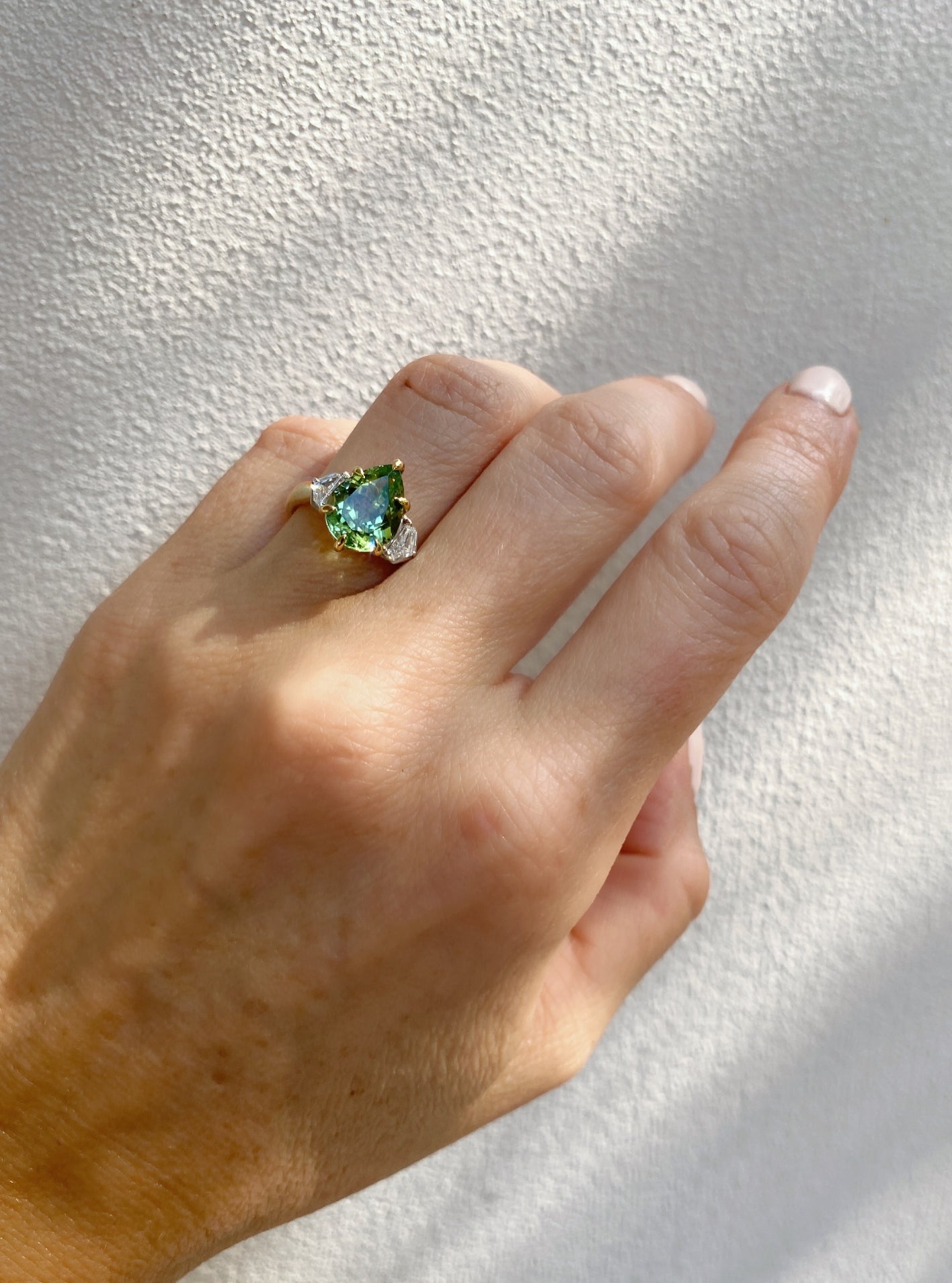 A vibrant pop of green, this pear shape tourmaline is flanked by two sparkling white diamonds for the perfect statement ring.