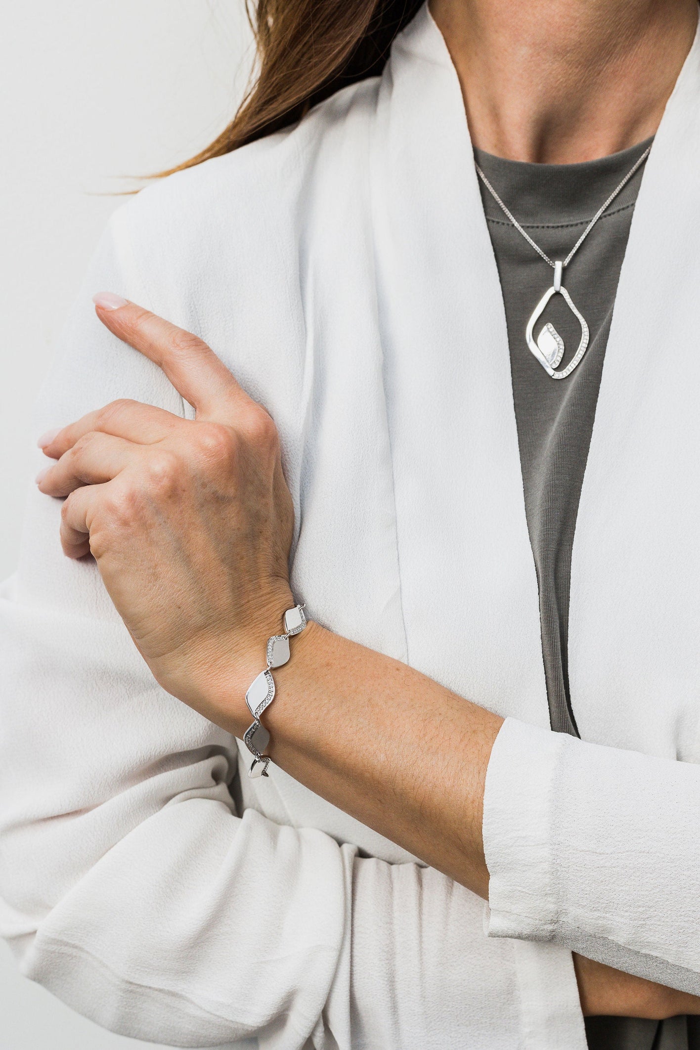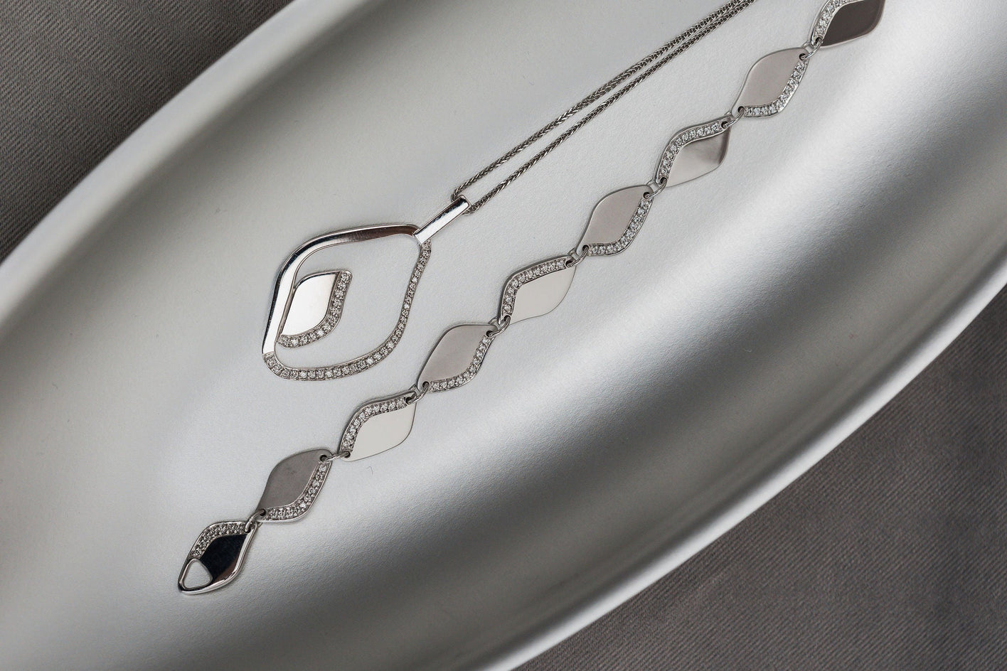 To be worn day or night, our classic lagoon pendant adds a sparkle to all occasions. Pave set with RBC diamonds in 14ct white gold, our double lagoon necklace measures 44mm in length.