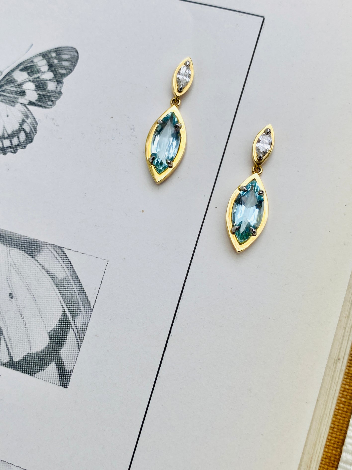 These Marquis shaped earrings feature beautiful Aquamarines and White Diamonds framed by 18ct Yellow Gold and Platinum.