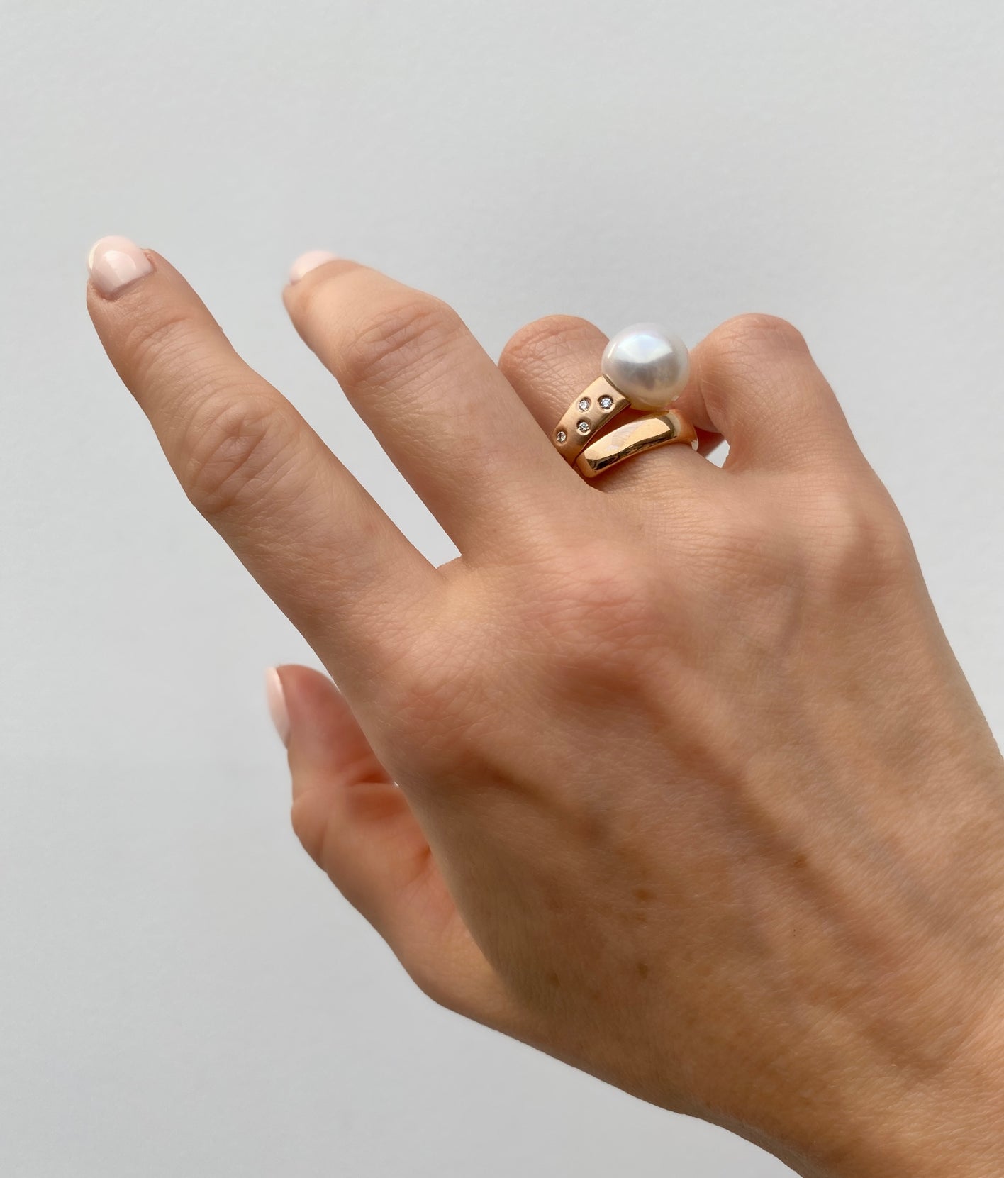 A Creation's favourite, our Australia South Sea Jaffa ring. Set in 9ct Rose gold with five small diamonds, punch set along a matt finished band, and 11.5mm white button pearl, offers an easy-to-wear, everyday pearl design.