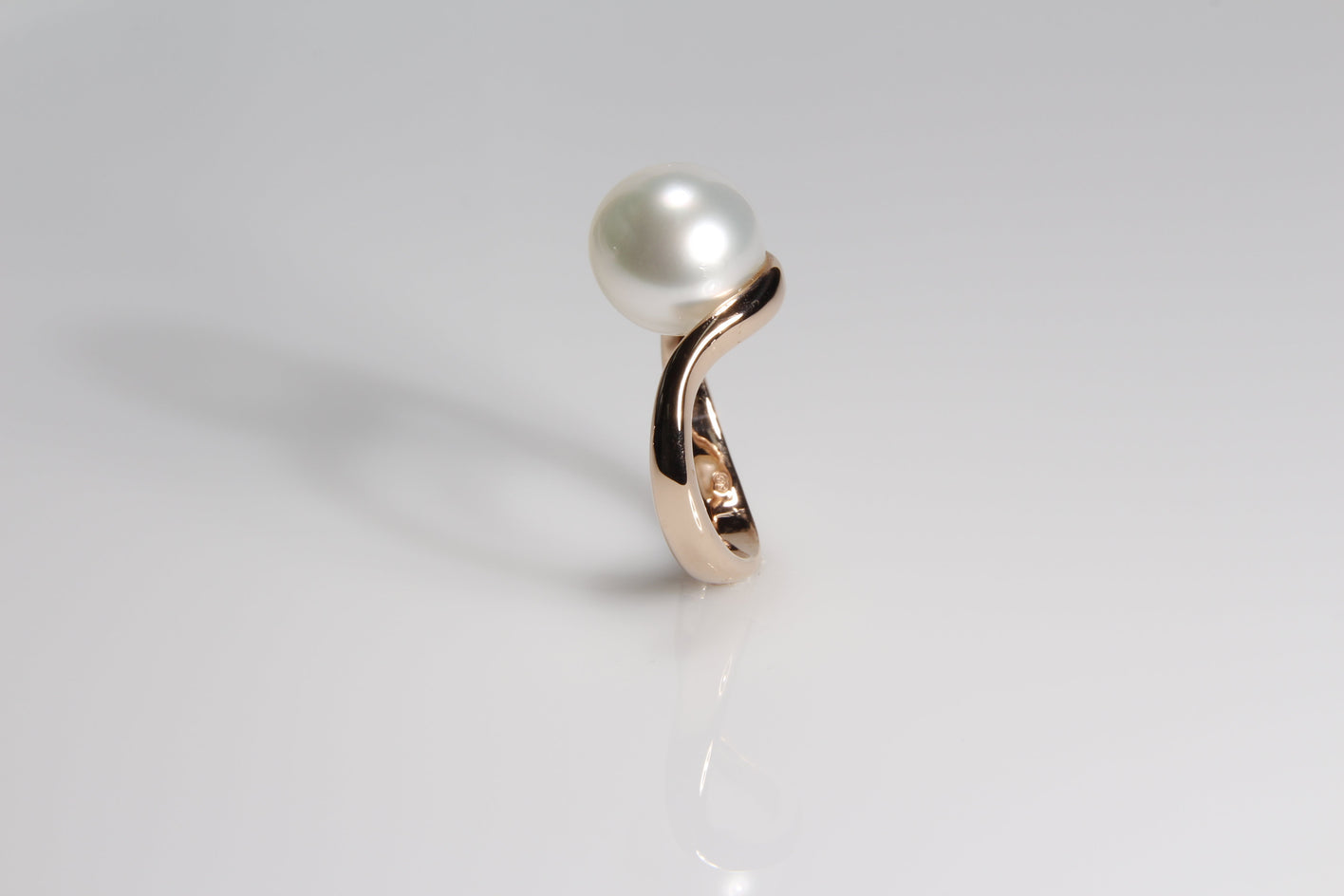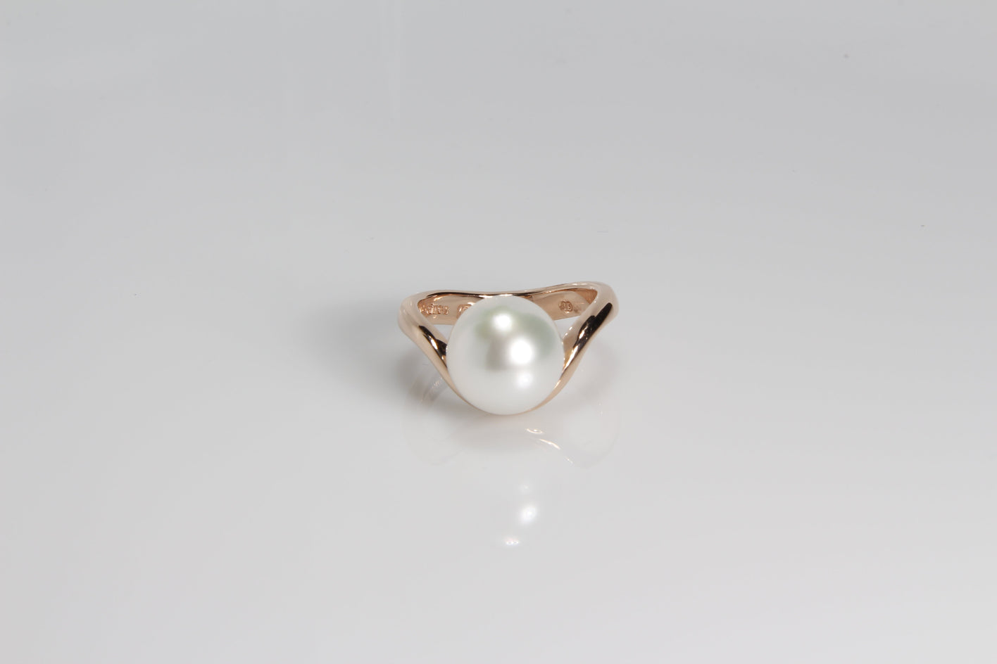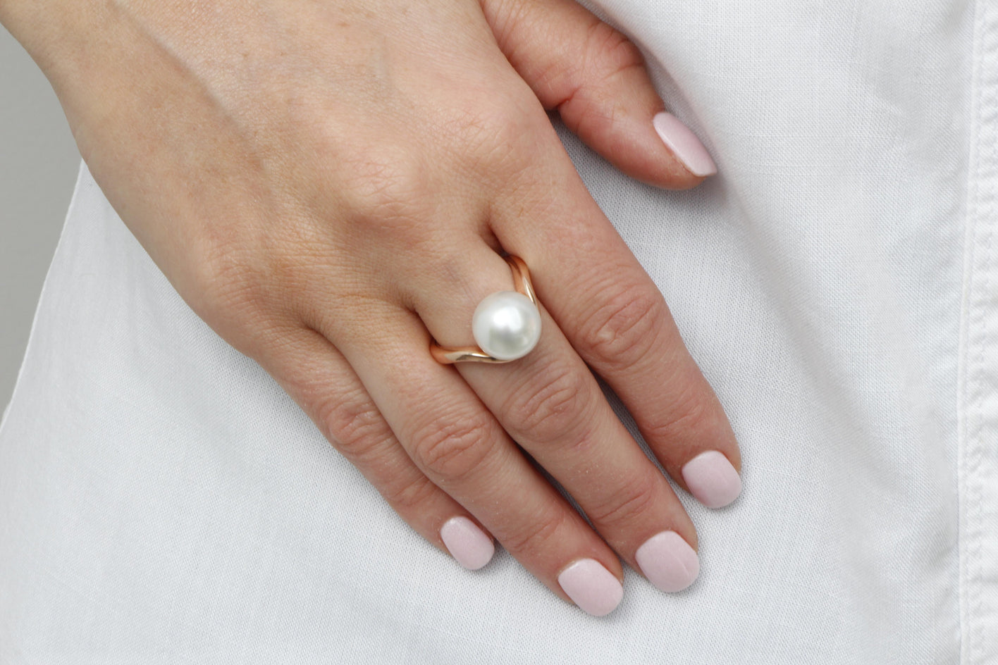 Wrapping around the pearl is a ribbon of 14ct rose gold, sitting the pearl as low as possible on the finger.