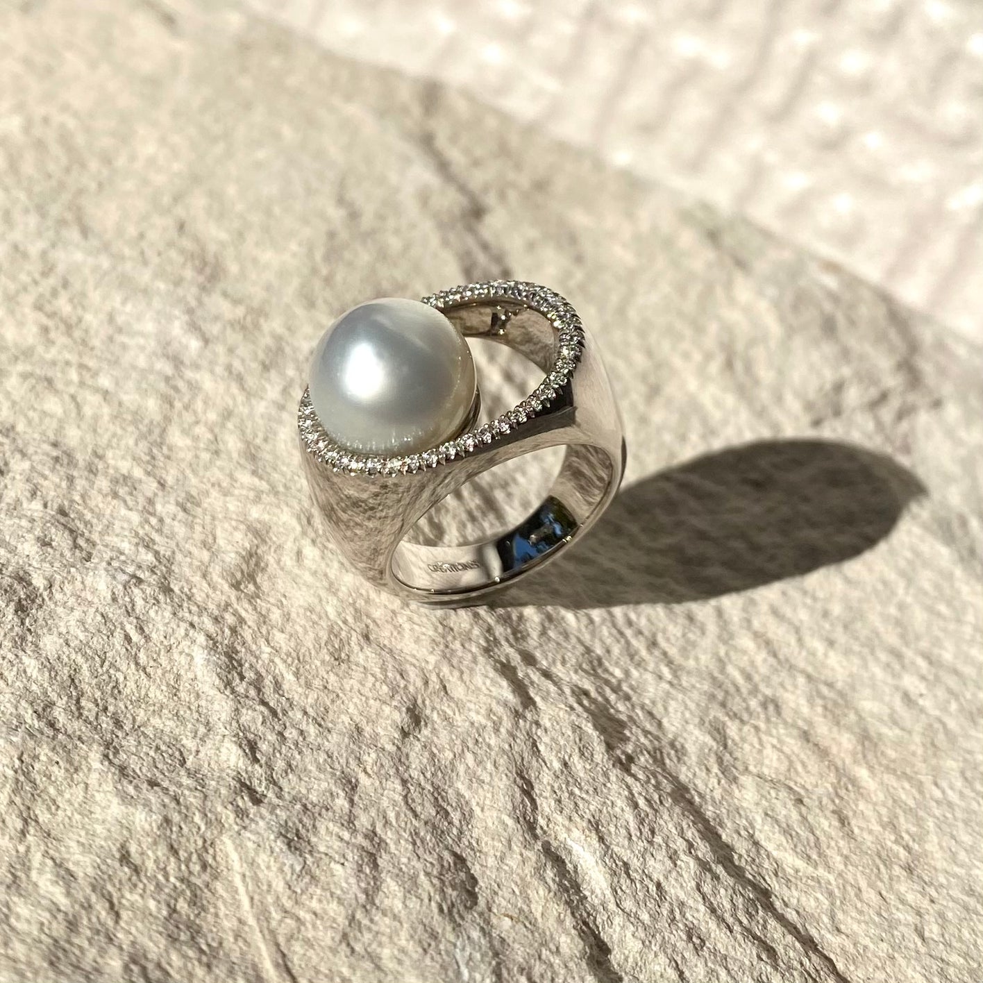 A classic Creation's pearl ring with substance. 14ct white gold En Ovale with an Australian South Sea pearl measuring 11.7mm surrounded by microclaw set white diamonds.