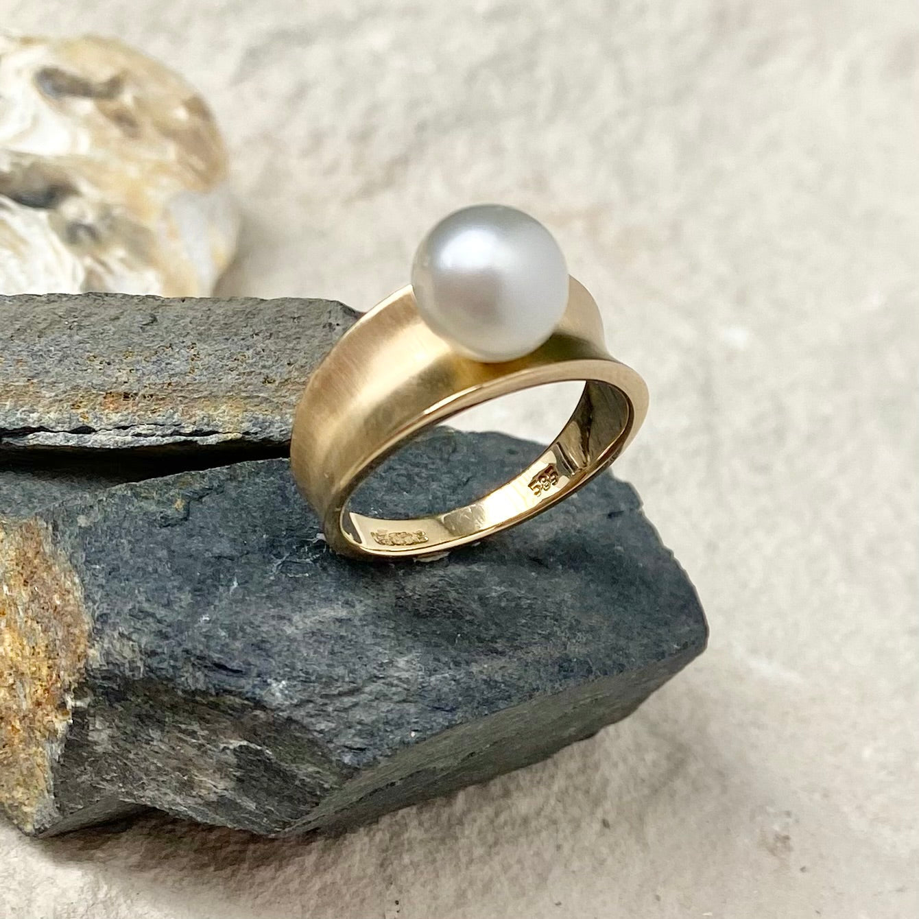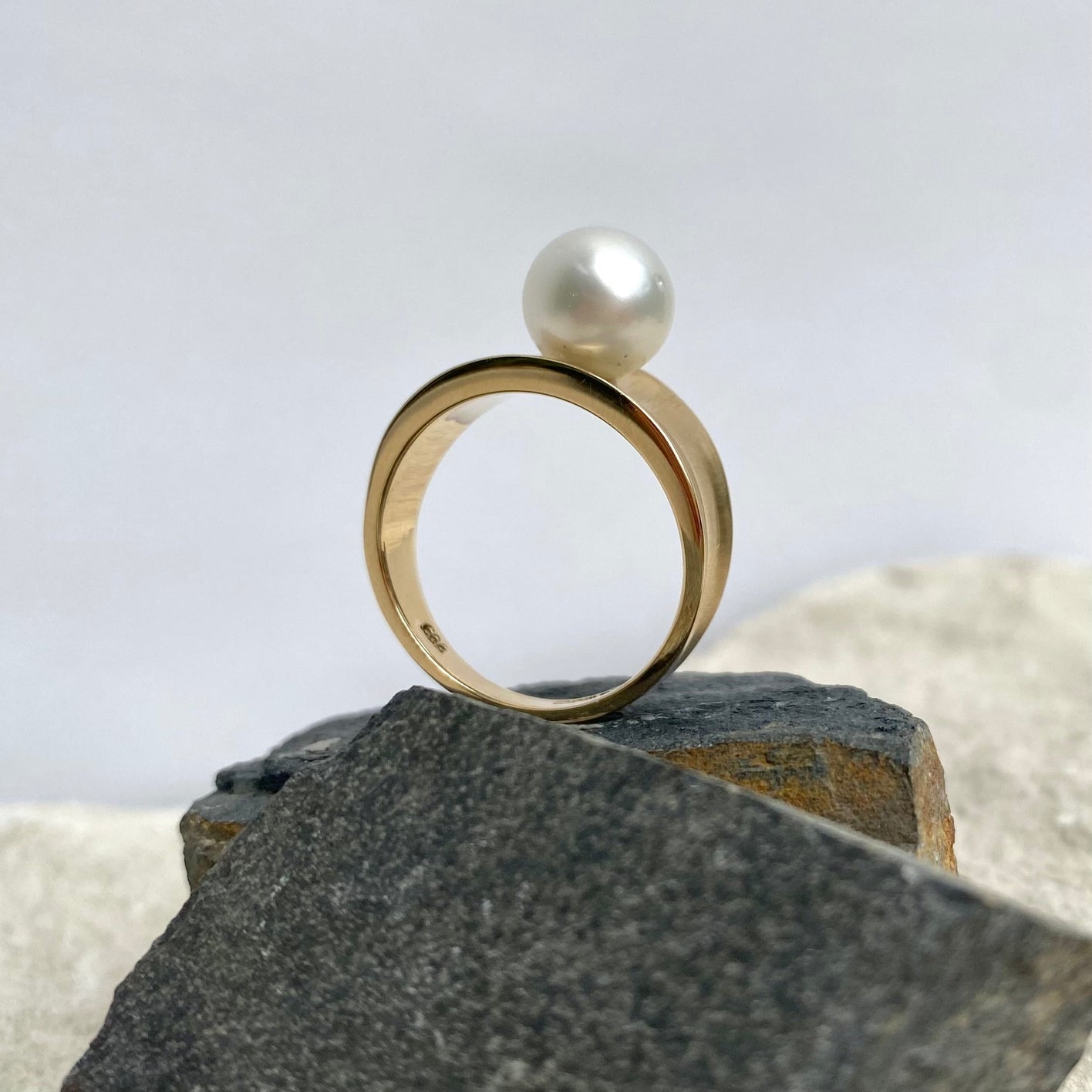 Our elegant pearl dish ring features an Australian South Sea pearl 9 mm, set in a 14ct yellow gold matte finished concave band.