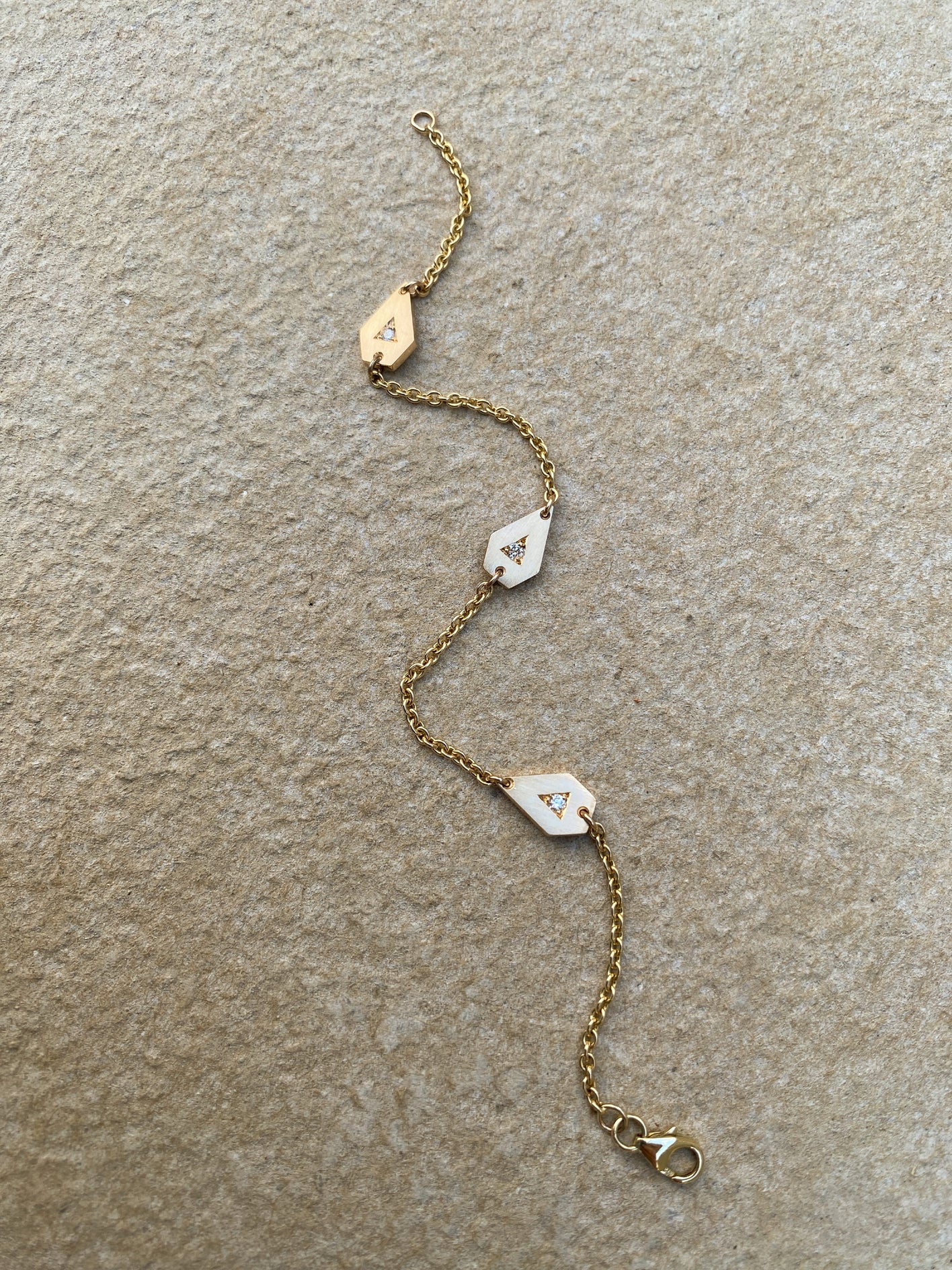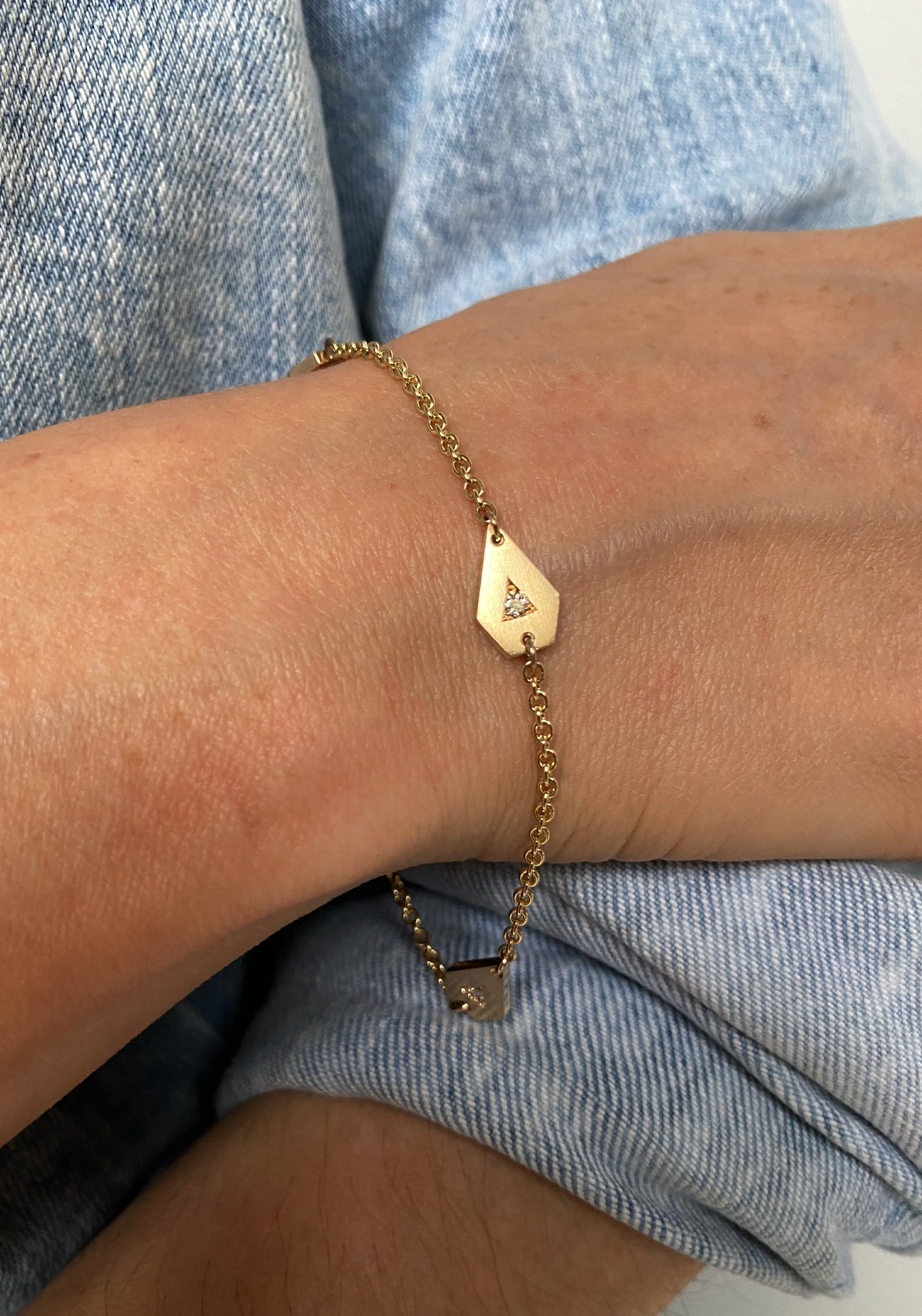 Easy to layer on the arm, or wear alone, it features three small Prisma links with a diamond on a 9ct yellow gold chain.