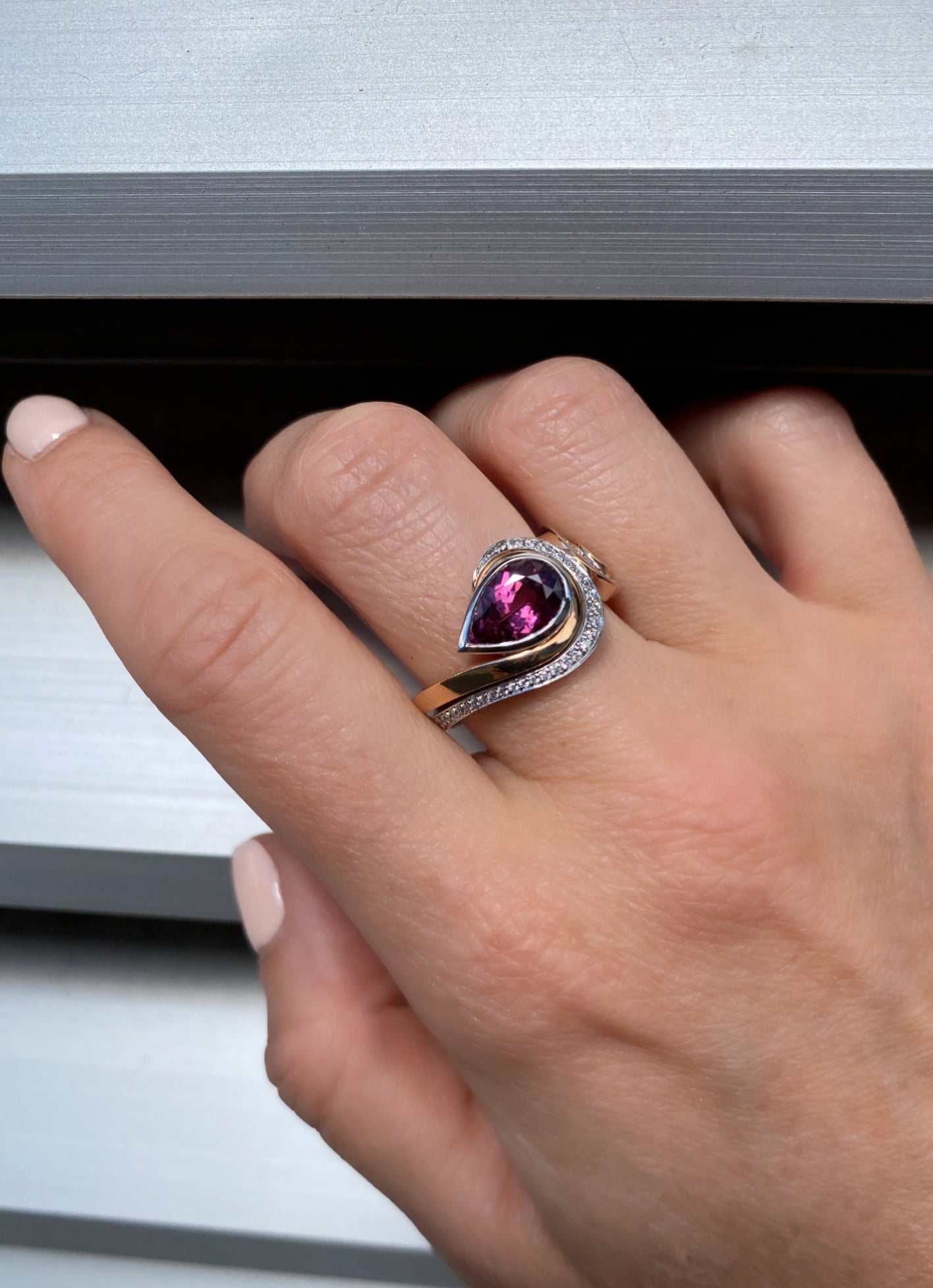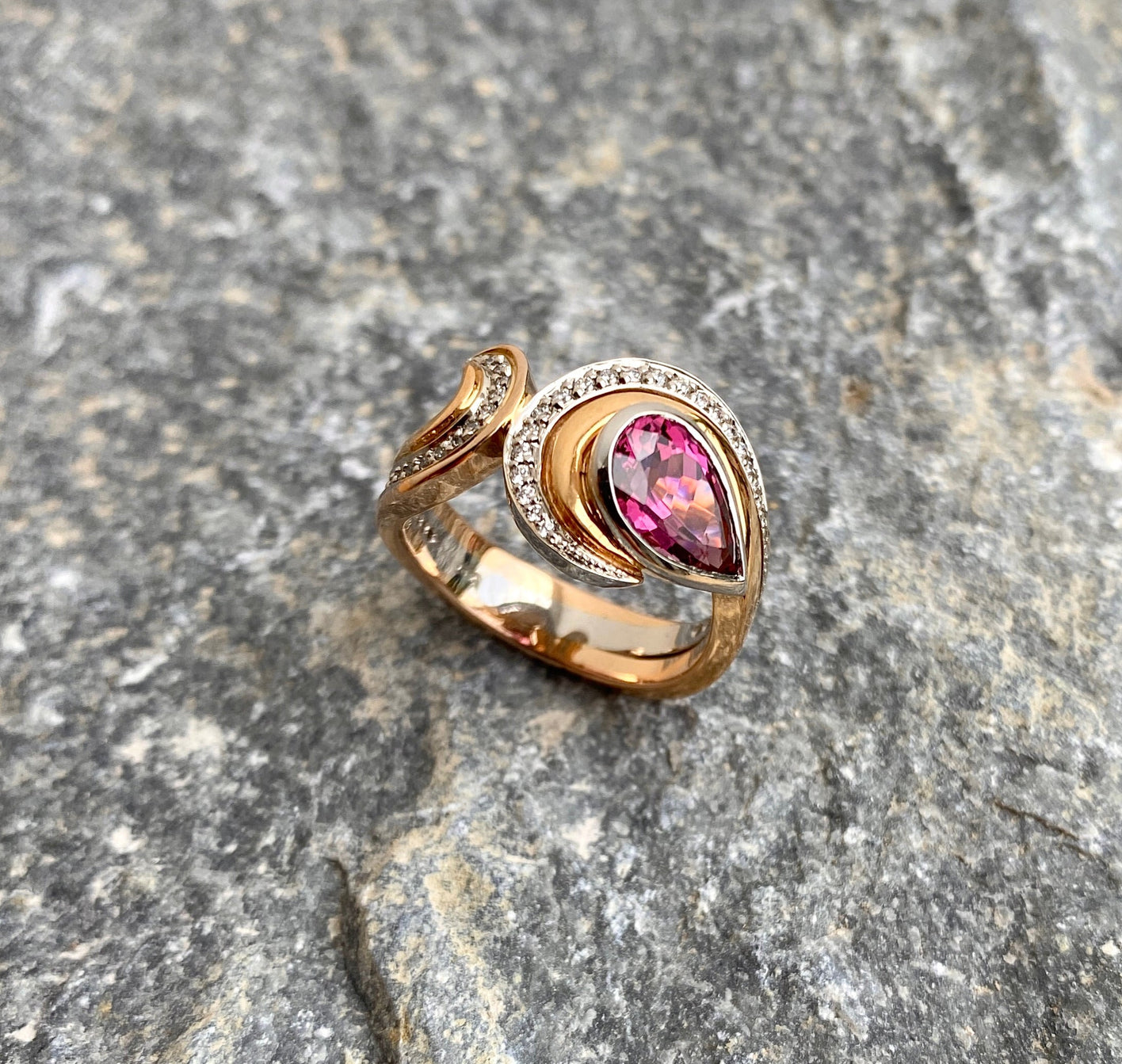Set in 18ct yellow gold and platinum our 2ct pear shaped red Spinel is wrapped elegantly in pave set diamonds.