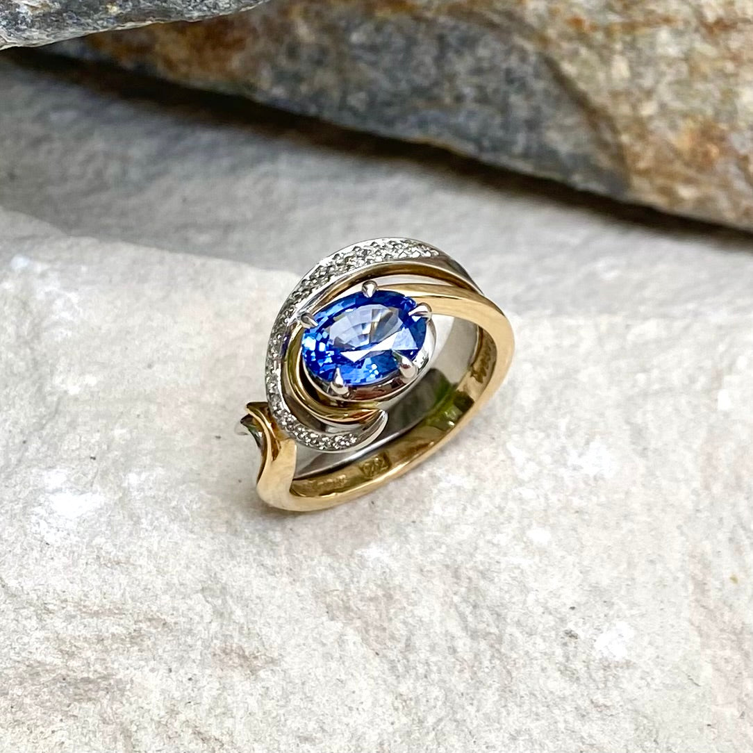Perfect for any sapphire lover, this Creations Signature Immersion ring has a beautiful light blue oval sapphire. Accented with 18 carat yellow gold and winding platinum set with glittering white diamonds.