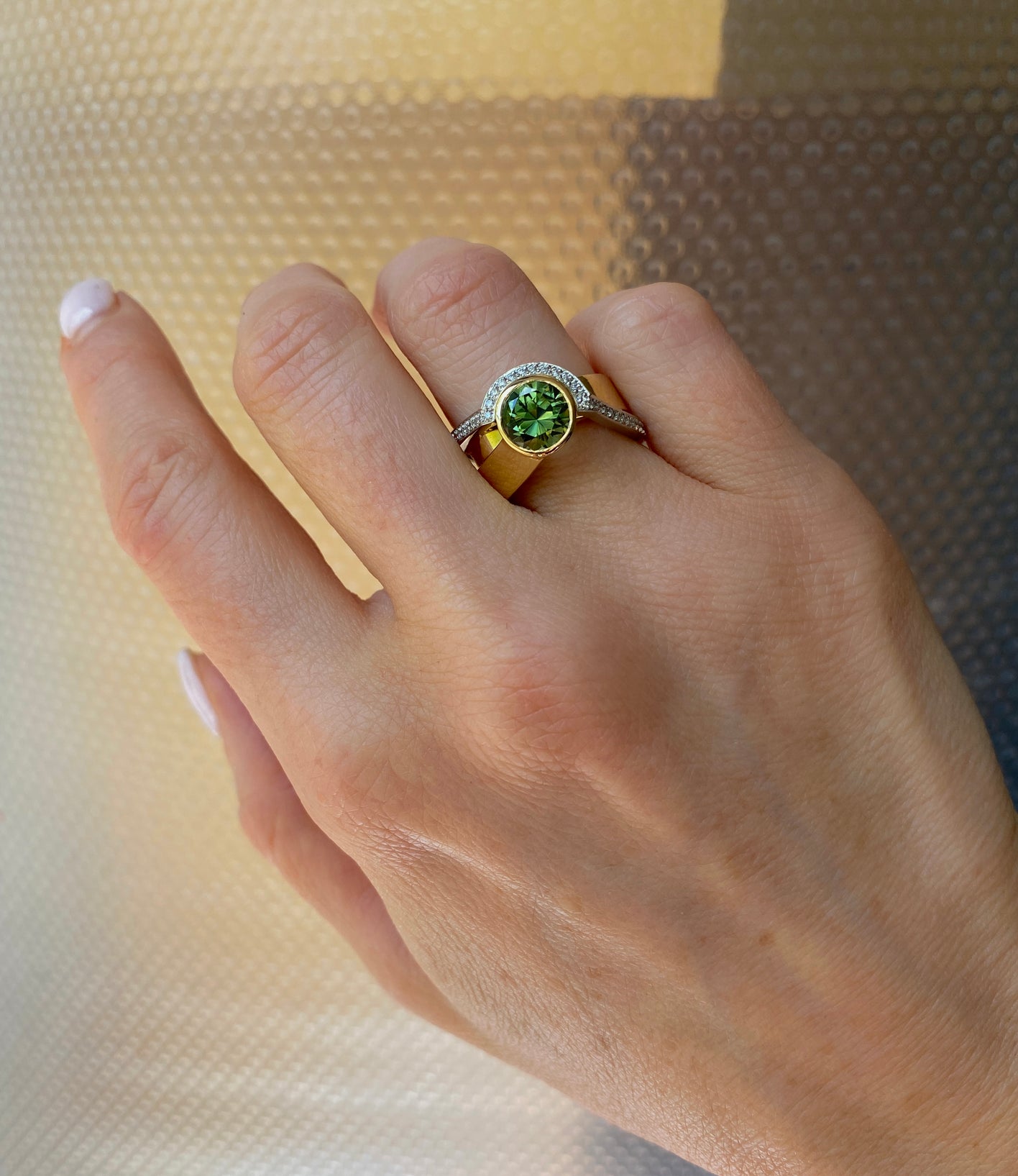 From the Capital collection inspired by Canberra a stunning natural green Australian Sapphire is the hero, wrapped in a Platinum band with pave diamonds. The 18ct yellow gold band adds warmth and versatility for everyday wear.