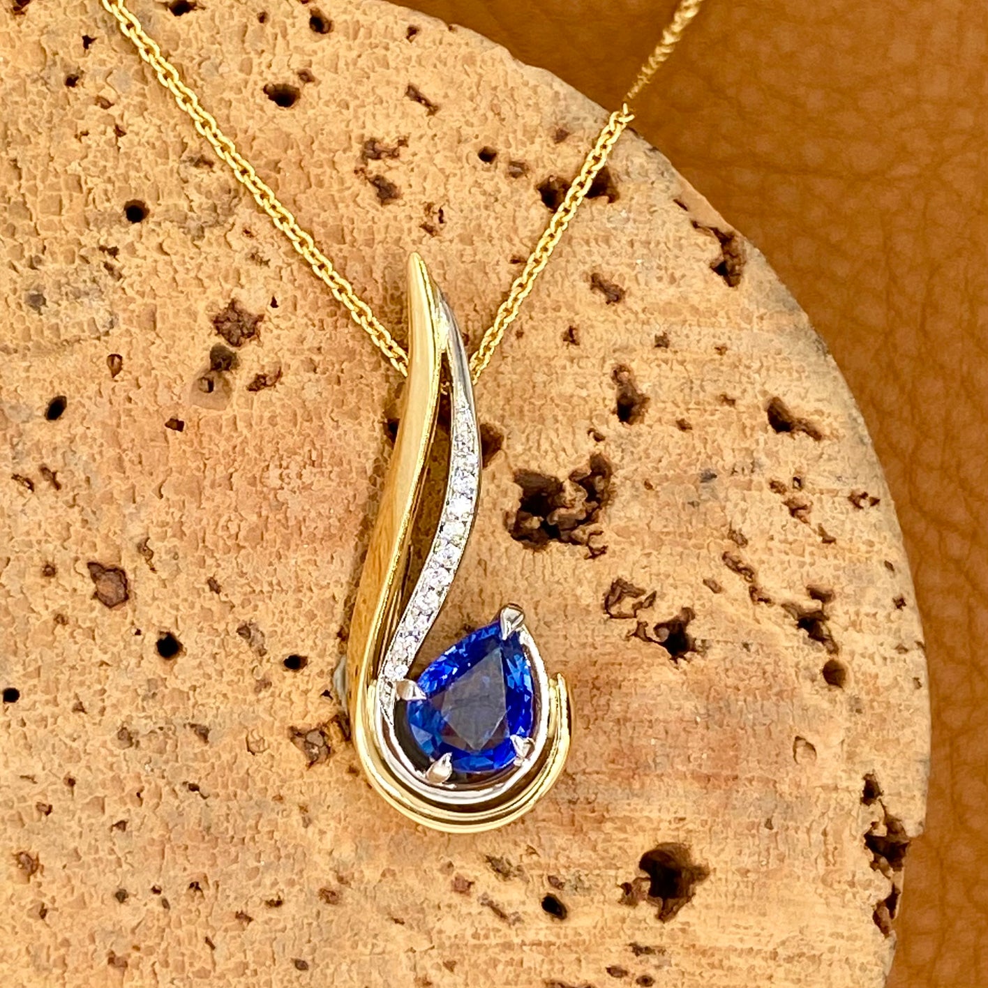 Featuring a vibrant 1.20ct pear shaped blue Sapphire, our 18ct yellow gold and platinum Immersion pendant sits on the neck with elegance and grace.