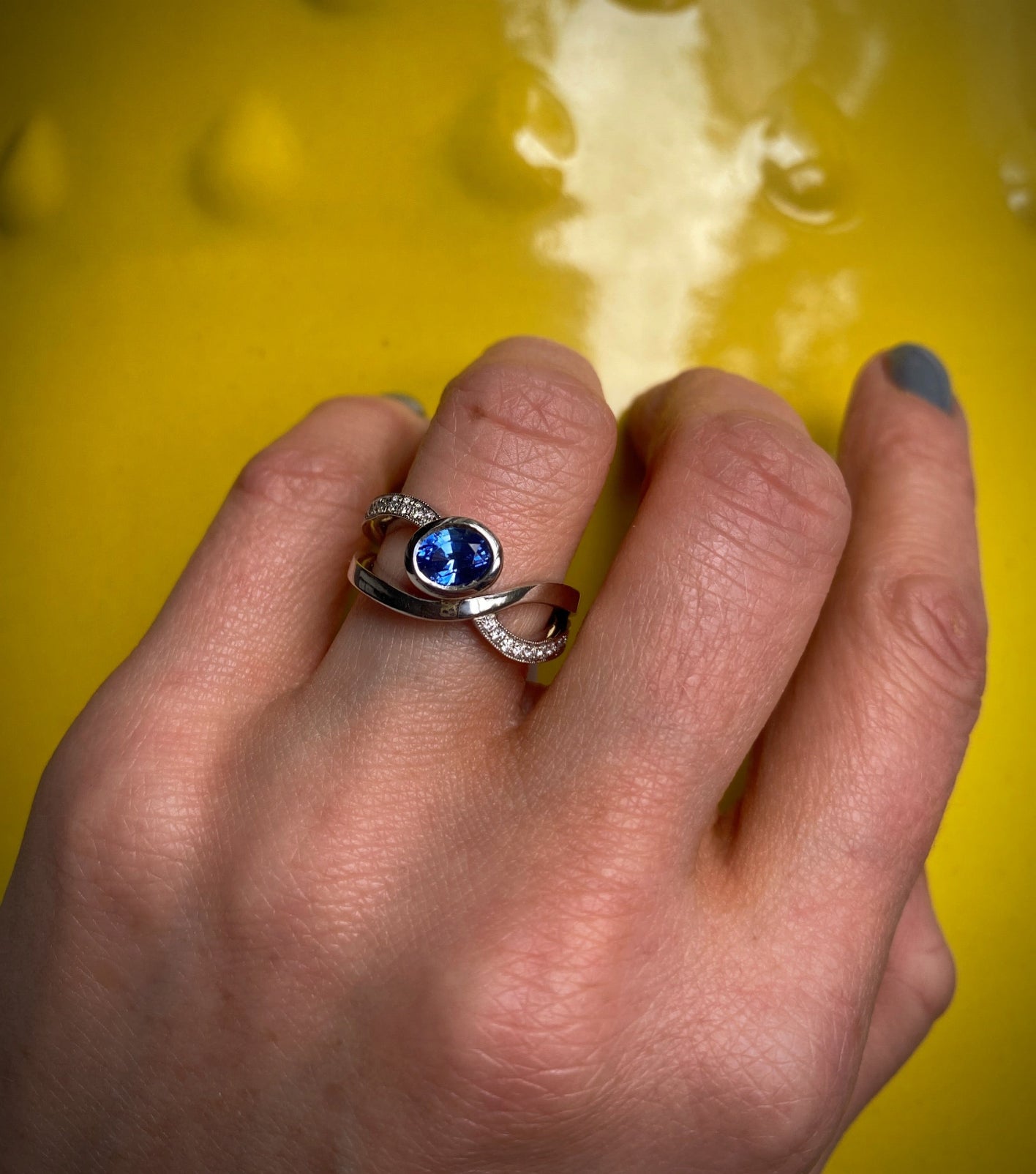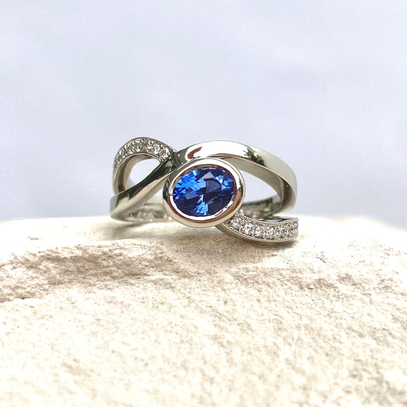 From the Creations Signature Duo collection is this stunning platinum ring featuring an eye-catching Oval Sapphire.
