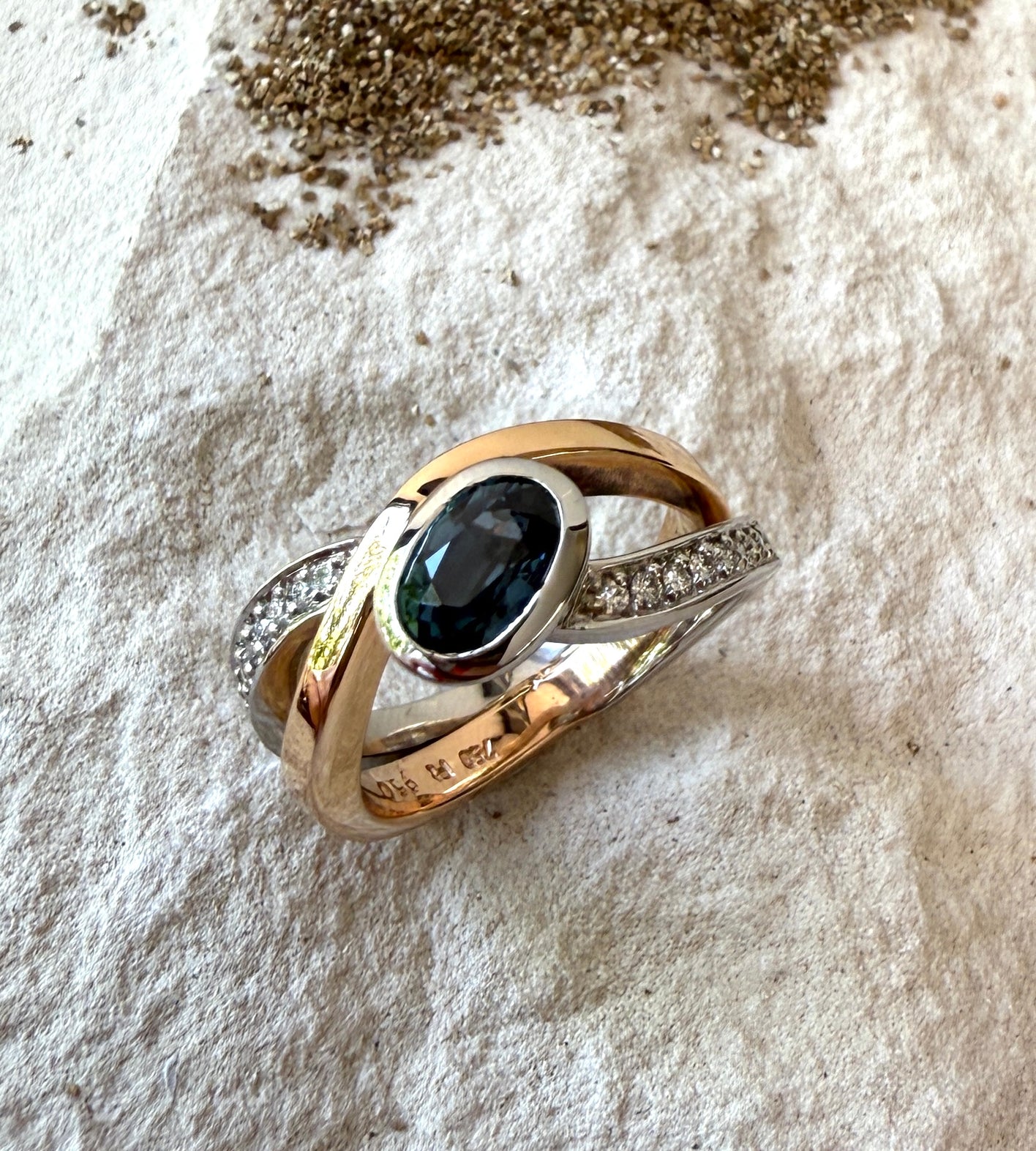 Featuring a stunning blue 1.40ct natural Sapphire bezel set in platinum with a ribbon of pave set natural white diamonds and an 18ct rose gold intersecting band, this ring is ready for daily wear.