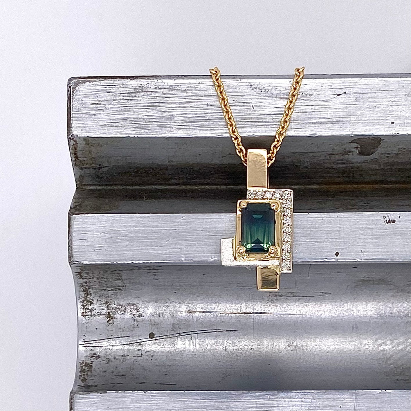 Perfect size and scale for everyday wear, our Metro pendant from our Signature collection adds plenty of personality to any outfit. Featuring an emerald cut Australian Sapphire from Inverell and set in 18ct yellow gold and platinum, our mini but mighty Metro has been designed and handmade in the Creations workshop.