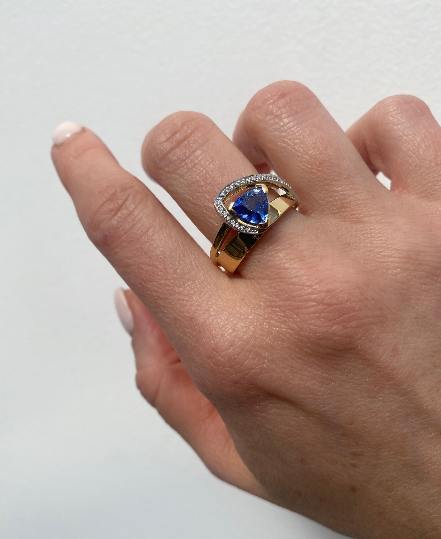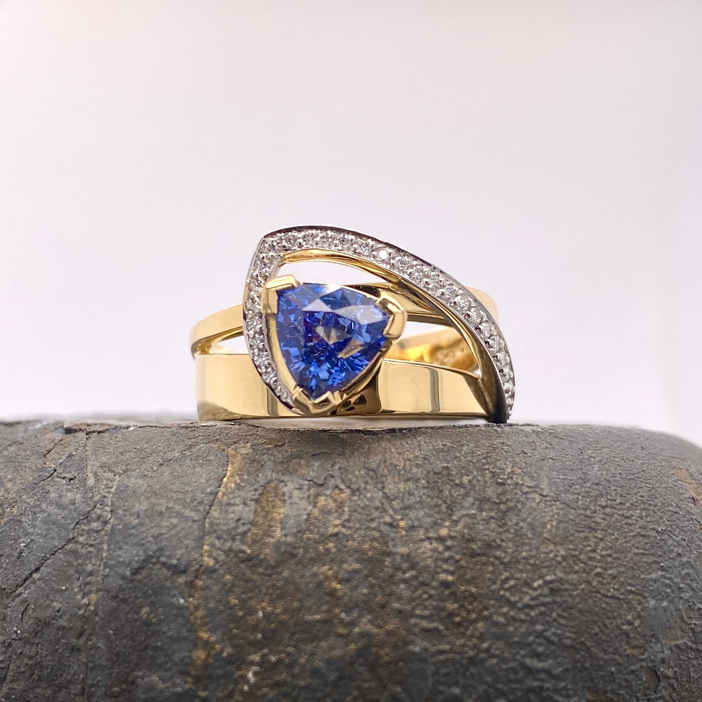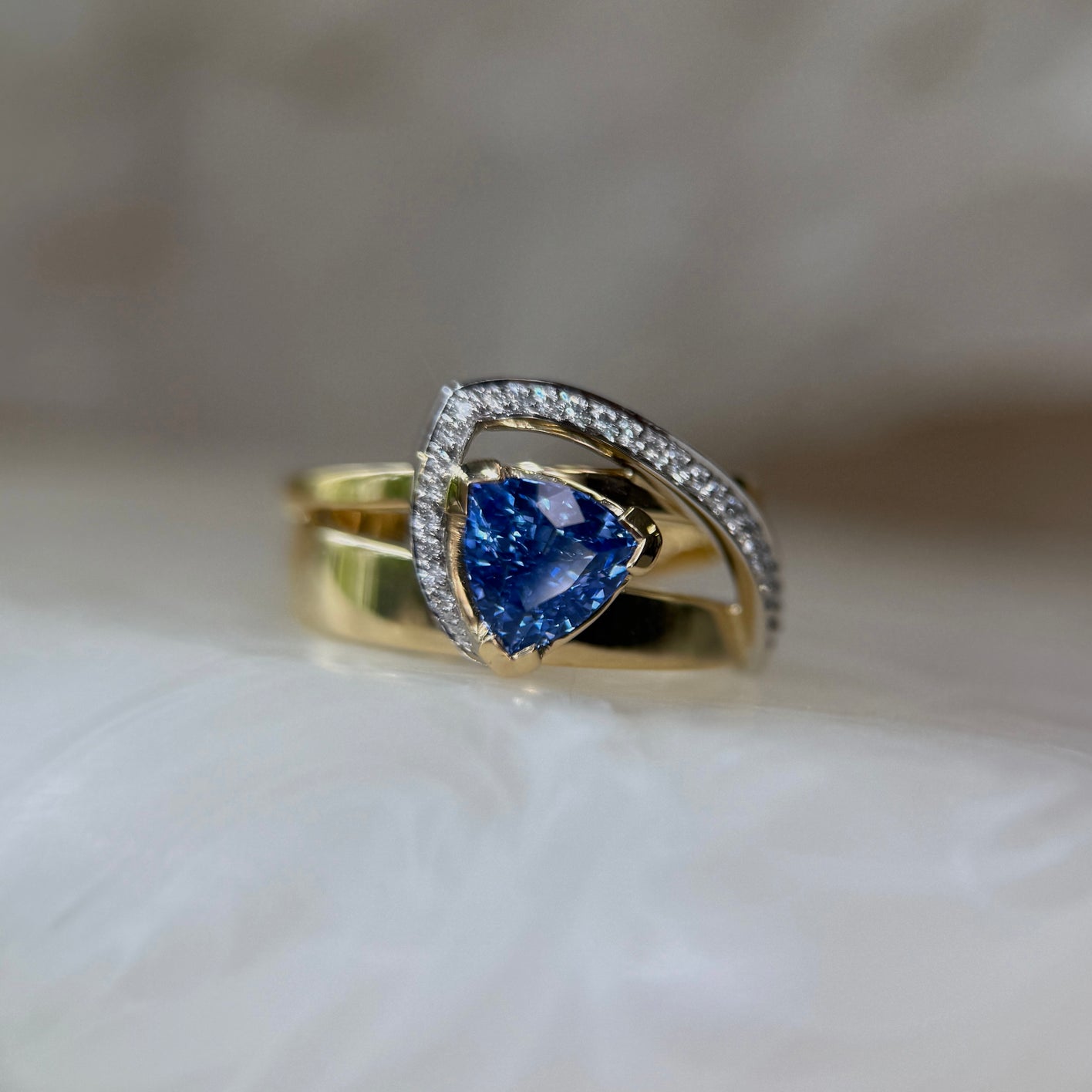 From our Signature collection, is another addition with our Reflections ring, featuring a stunning natural Blue Ceylon Trilliant cut Sapphire, weighing 1.56ct. Platinum pave set round white diamonds sweep over to meet the sapphire with two 18ct yellow gold bands beneath.